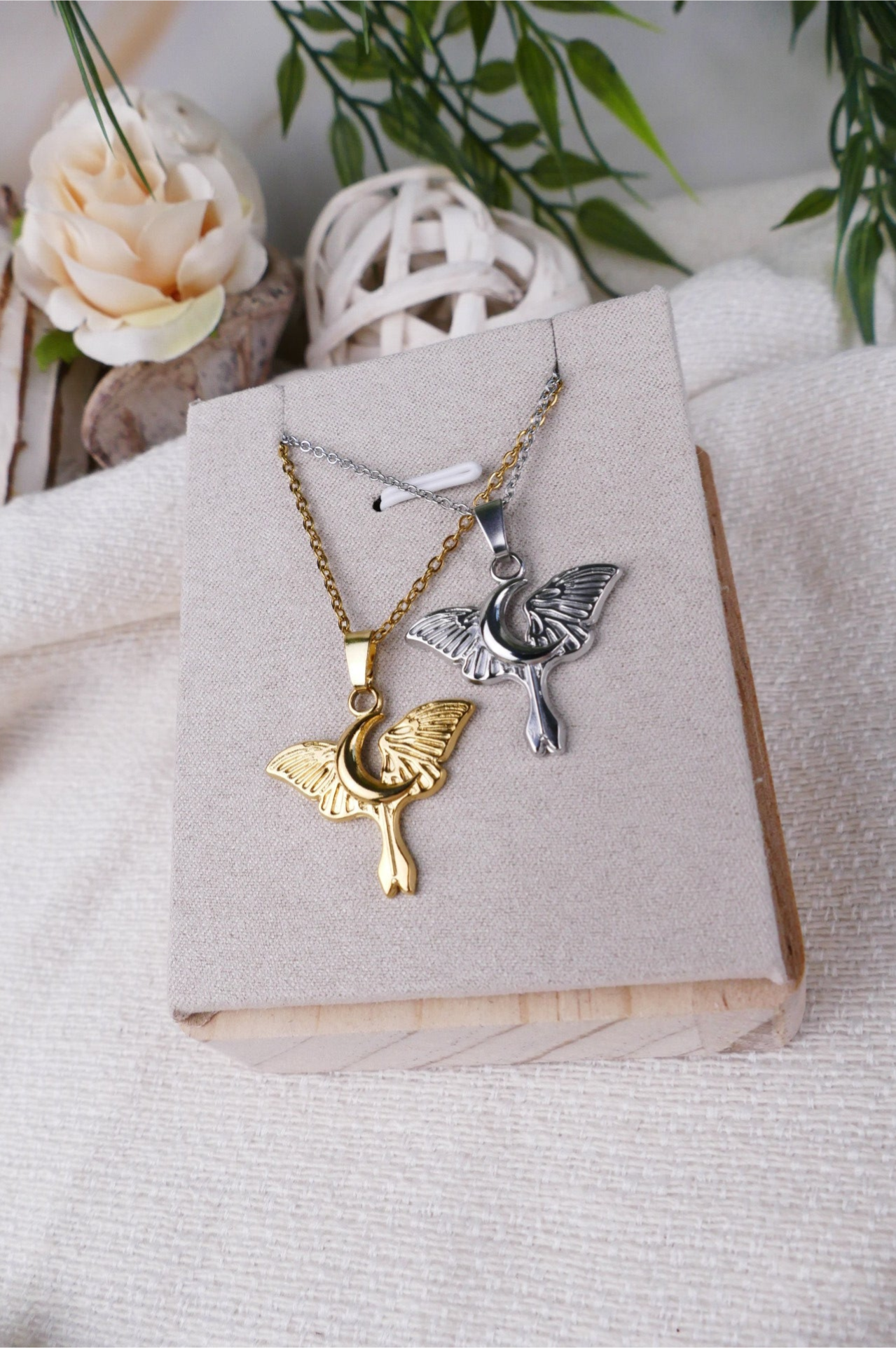 Diese filigrane Edelstahlkette hat einen Anhänger mit einer Mondmotte als Motiv.