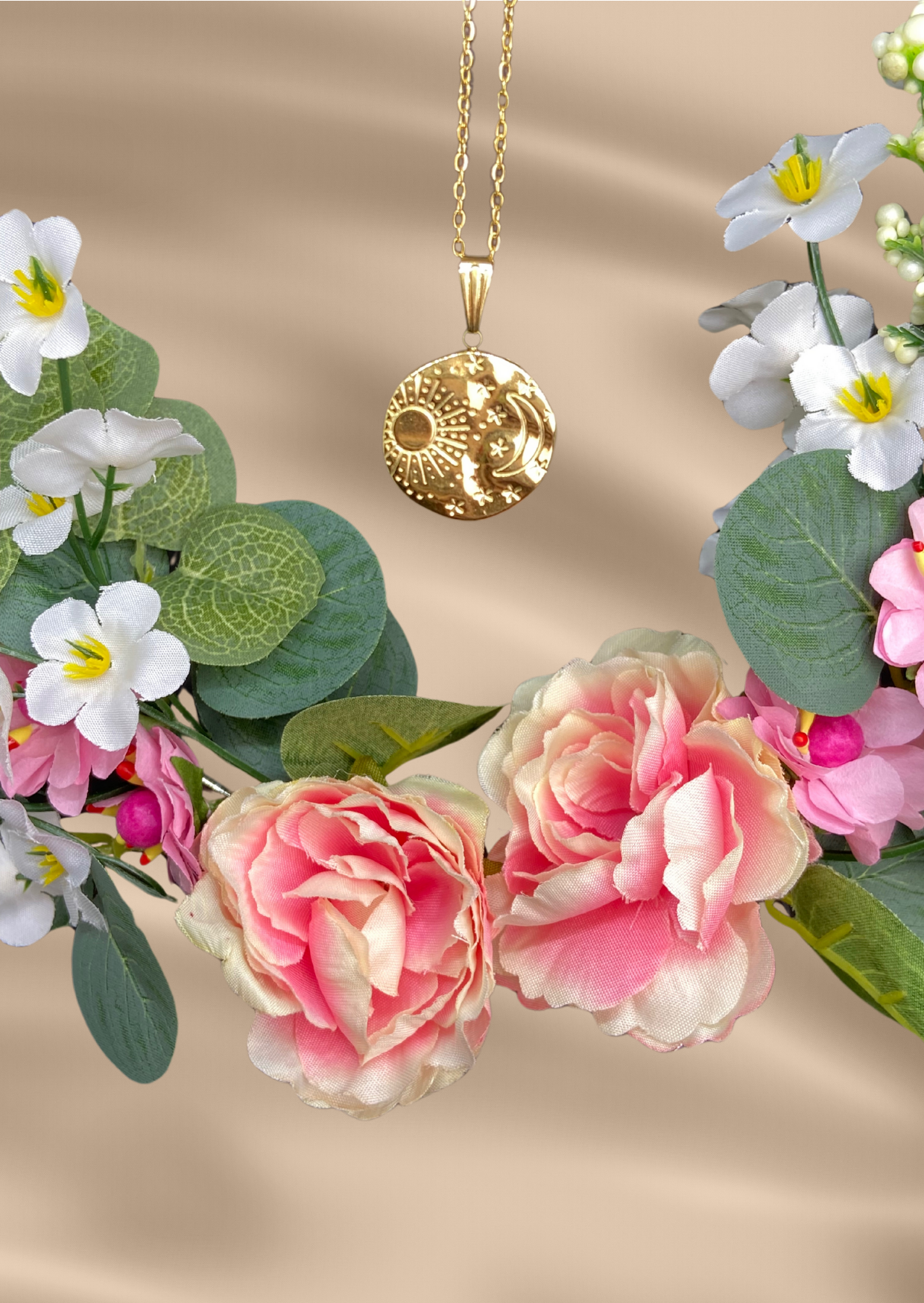 Vergoldete Edelstahlkette mit rundem Anhänger mit Sonne und Mond