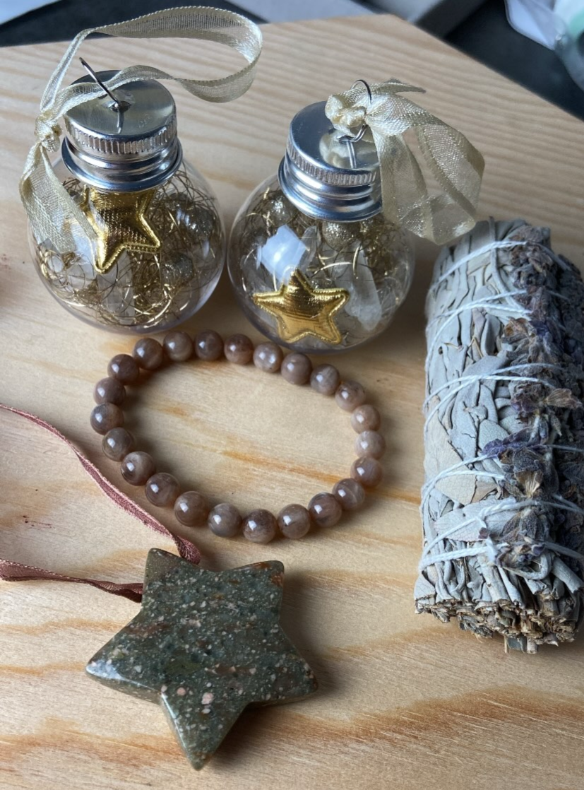 2x Weihnachtsbaumschmuck Kugel Bergkristall Gold 10€, Mondstein Armband 17€, Salbei Lavendel 8€, Unakit Stern 5€, Bergkristall Schneeflocke Anhänger Silber 10€.