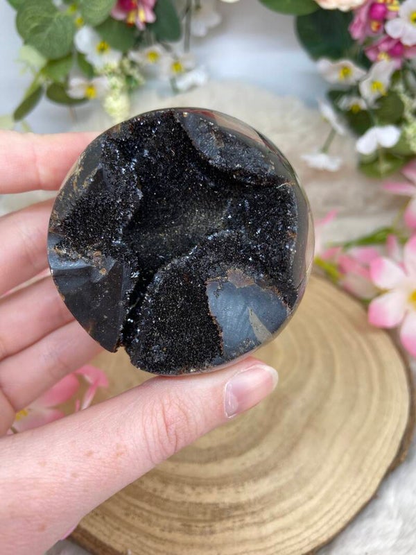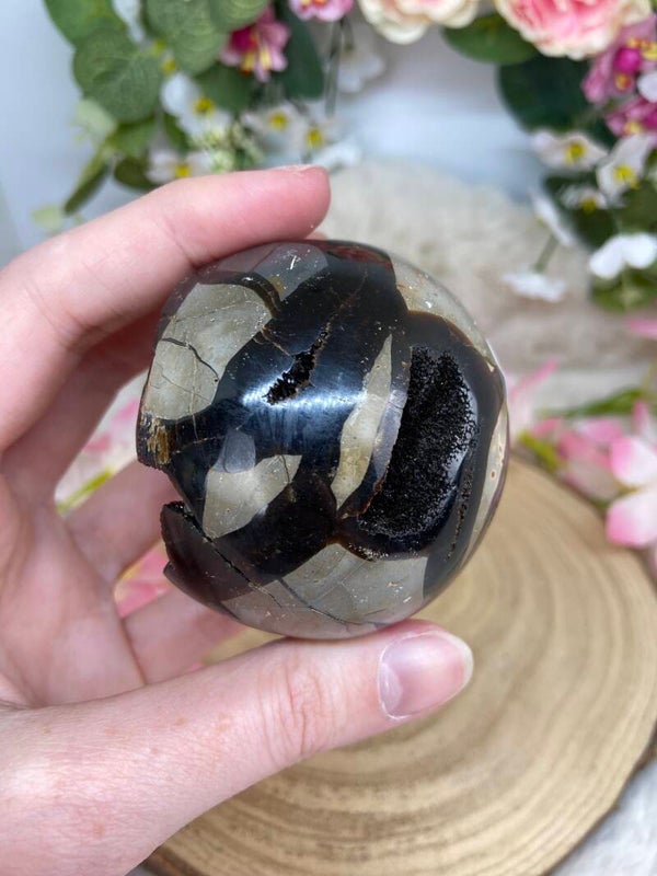 Halboffene kristallisierte Septarien Kugel.