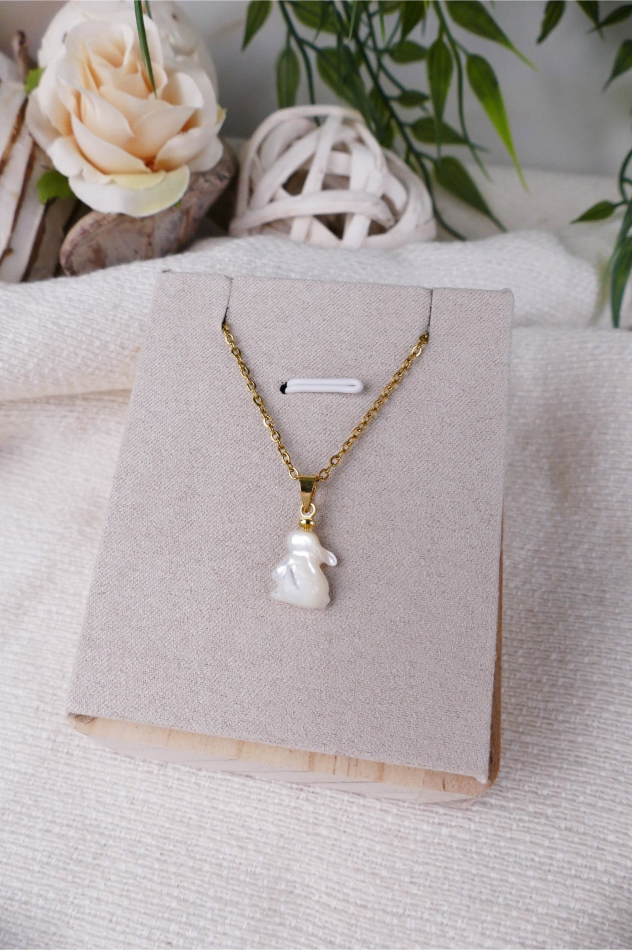 Diese filigrane Edelstahlkette hat einen Anhänger in Form eines Hasen aus Süßwasserperle.