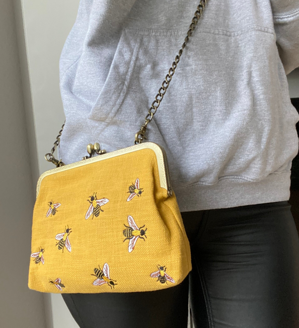 Hochwertige bestickte Handtasche mit Bienen auf gelbem Untergrund. Beidseitig bestickt. Der Taschenriemen ist abnehmbar und kann gewechselt werden. Du hast die Wahl zwischen einem kurzen Kunstlederriemen oder einer langen Metallkette, um die Tasche als Umhängetasche zu tragen. Das Innenfutter ist hell mit dunklen Punkten. Innen ist eine Reißverschlusstasche eingenäht.