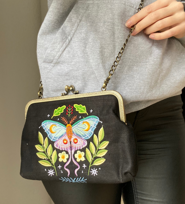 Hochwertige bestickte Handtasche mit Motte auf schwarzem Untergrund. Einseitig bestickt. Der Taschenriemen ist abnehmbar und kann gewechselt werden. Du hast die Wahl zwischen einem kurzen Kunstlederriemen oder einer langen Metallkette, um die Tasche als Umhängetasche zu tragen. Das Innenfutter ist schwarz mit hellen Punkten. Innen ist eine Reißverschlusstasche eingenäht.