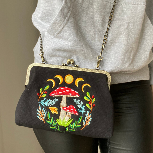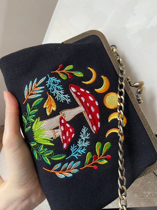 Hochwertige bestickte Handtasche mit Pilz und Mondphasen auf schwarzem Untergrund. Einseitig bestickt. Der Taschenriemen ist abnehmbar und kann gewechselt werden. Du hast die Wahl zwischen einem kurzen Kunstlederriemen oder einer langen Metallkette, um die Tasche als Umhängetasche zu tragen. Das Innenfutter ist schwarz mit hellen Punkten. Innen ist eine Reißverschlusstasche eingenäht.