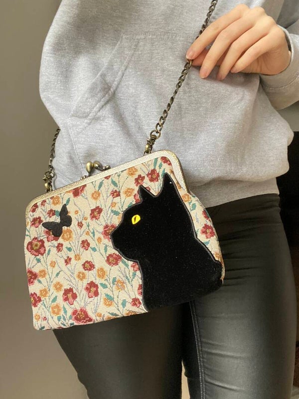 Hochwertige bestickte Handtasche mit Katze und Schmetterling auf hellem vintage Untergrund. Einseitig bestickt. Die Katze und der Schmetterling sind aus Samt. Der Taschenriemen ist abnehmbar und kann gewechselt werden. Du hast die Wahl zwischen einem kurzen Kunstlederriemen oder einer langen Metallkette, um die Tasche als Umhängetasche zu tragen. Das Innenfutter ist hell mit dunklen Punkten. Innen ist eine Reißverschlusstasche eingenäht.
