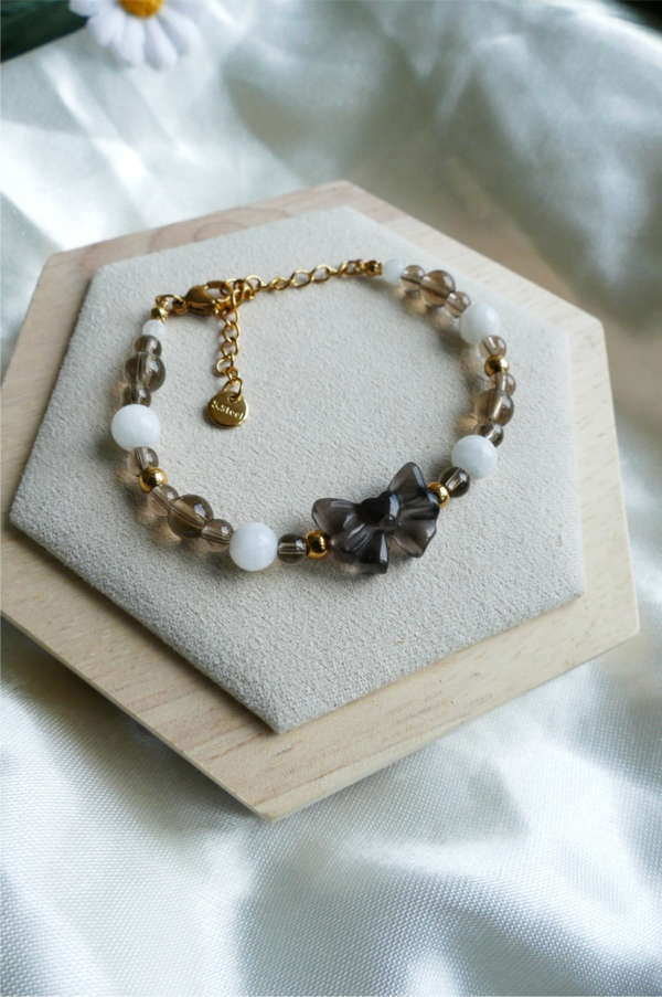 Dieses Edelstein Armband ist ein Einzelstück und wurde von mir handgefertigt. Es besteht aus Rauchquarz und weißen Mondstein Perlen. Die Schleife in der Mitte ist aus Eisobsidian.