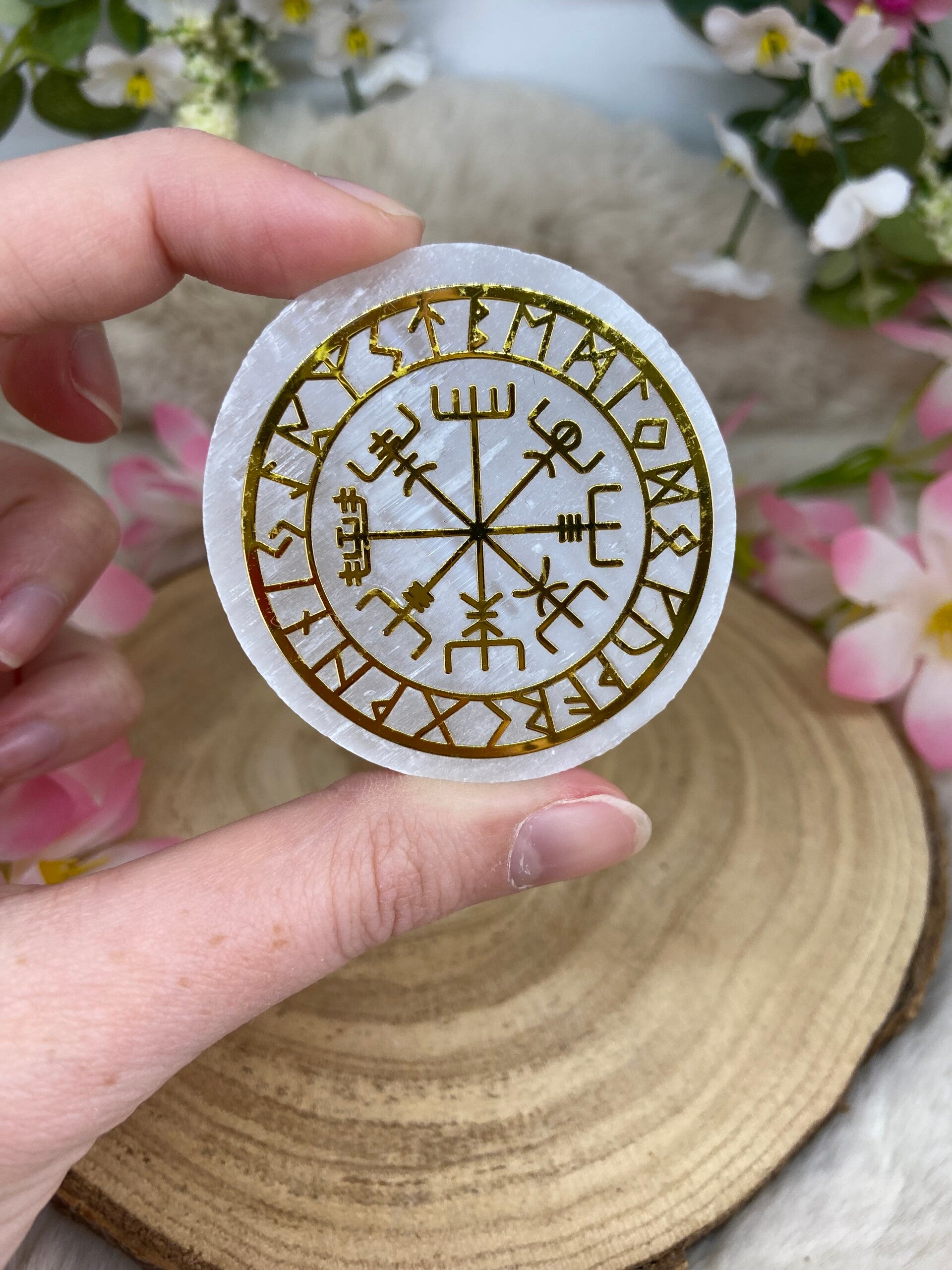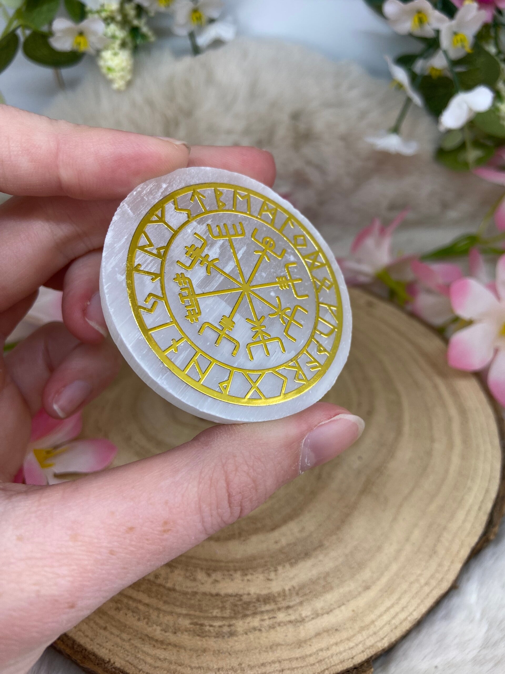 Runde Platte mit Runen aus Selenit.