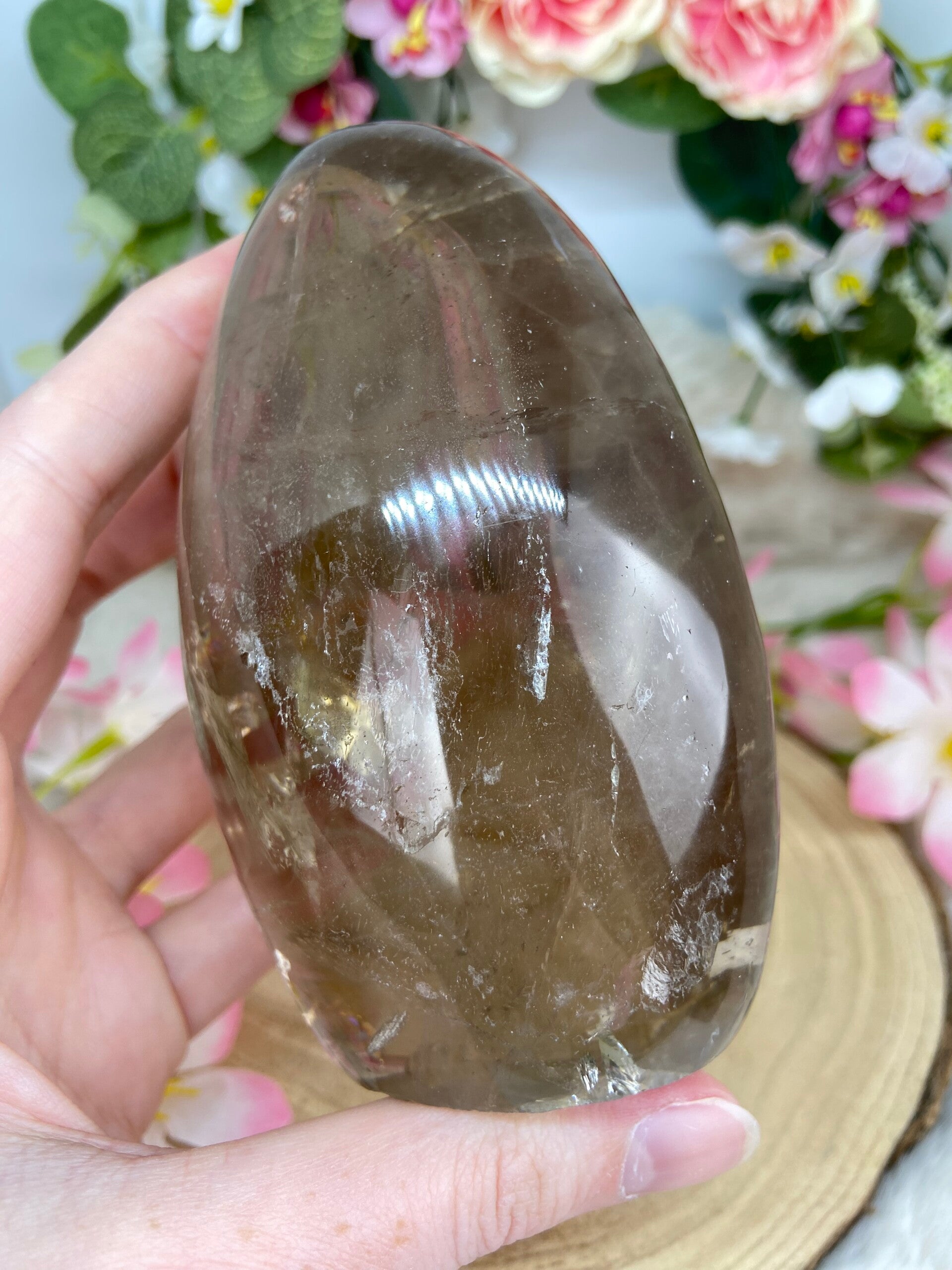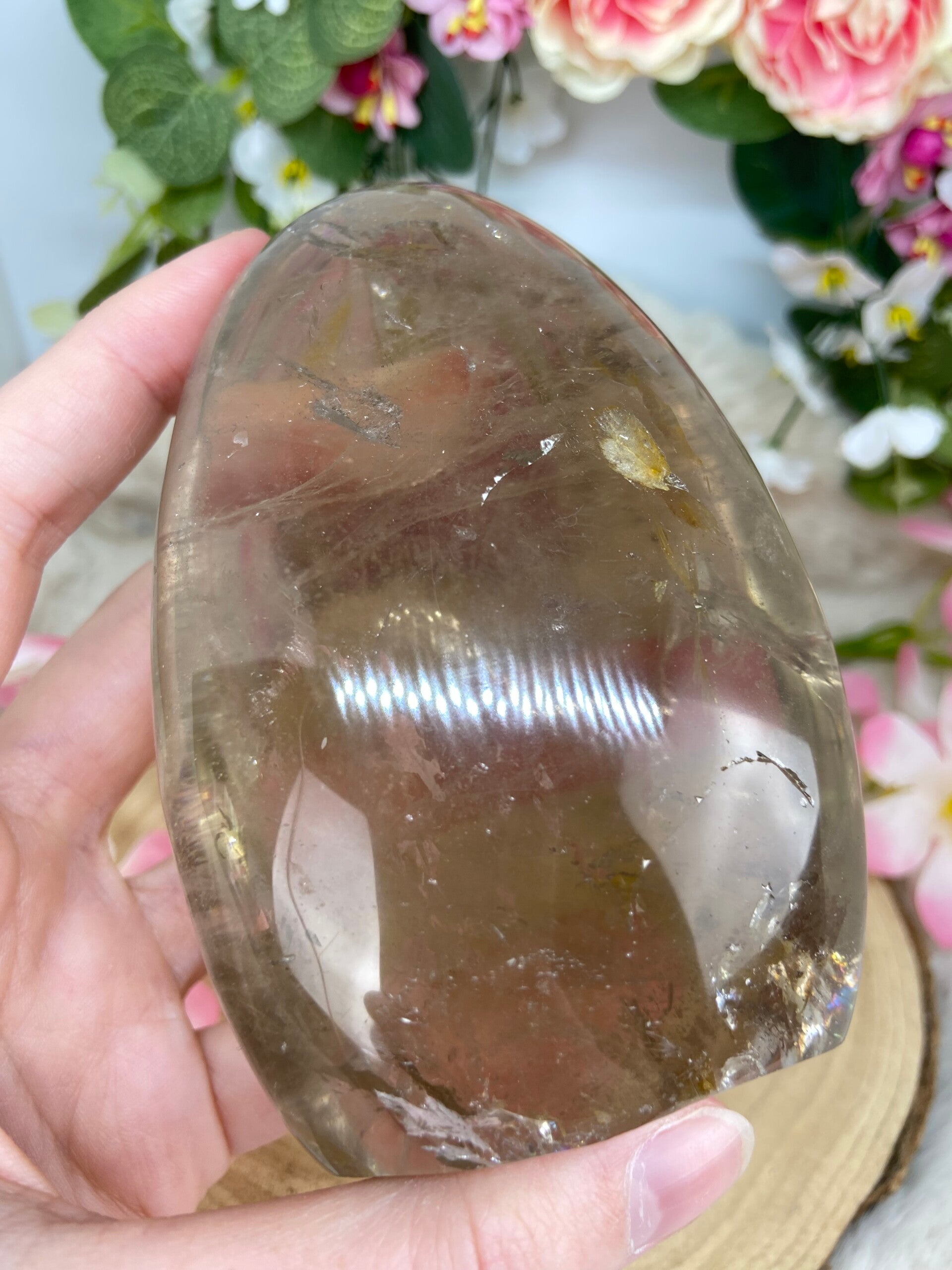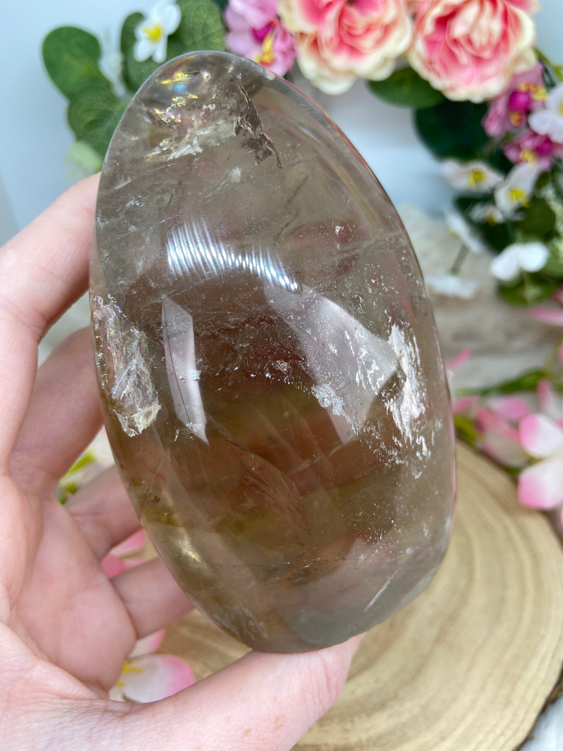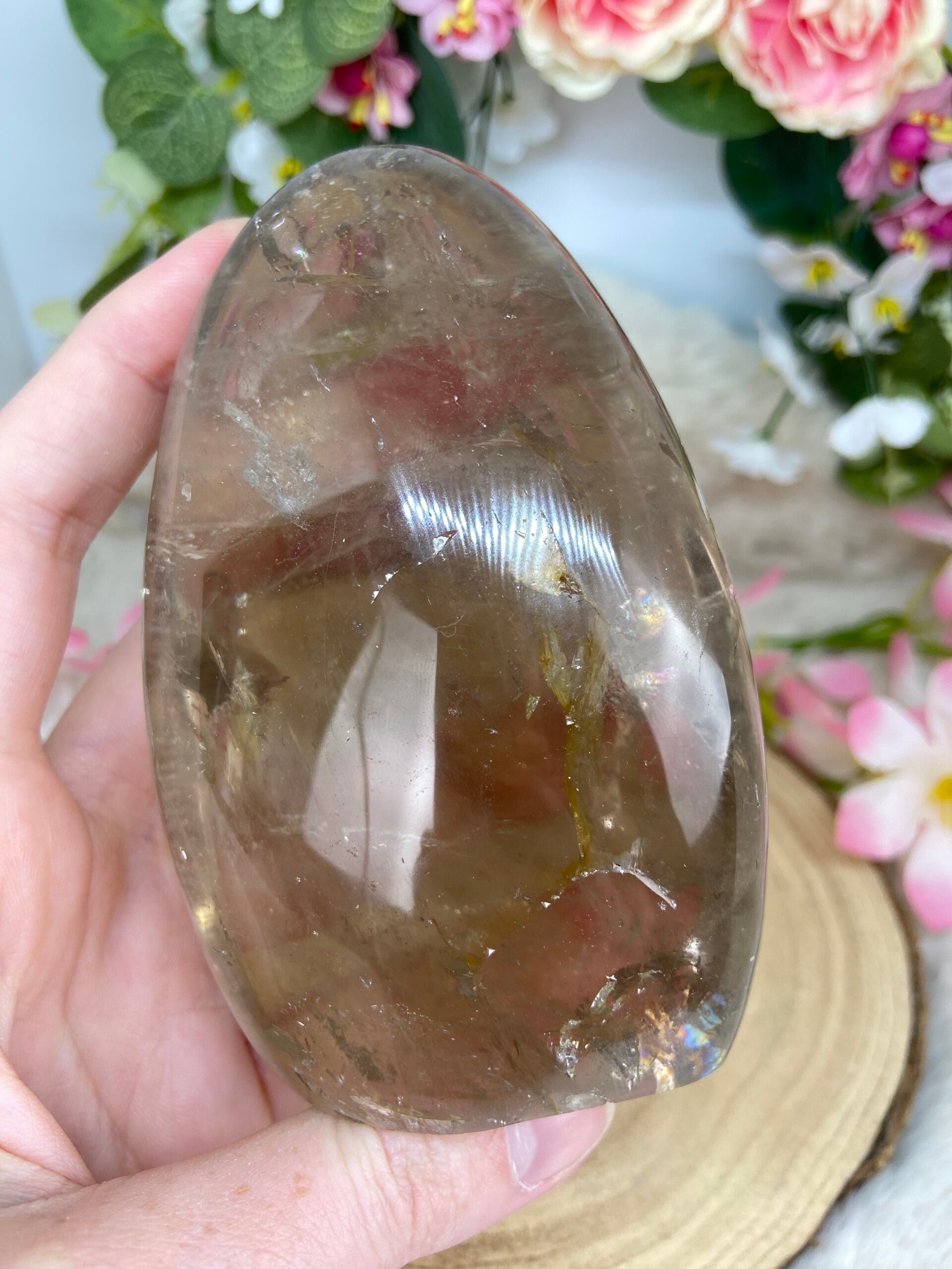 Schöne leicht dunklere Rauchquarz Freiform mit Regenbögen und Eiseneinschlüssen.