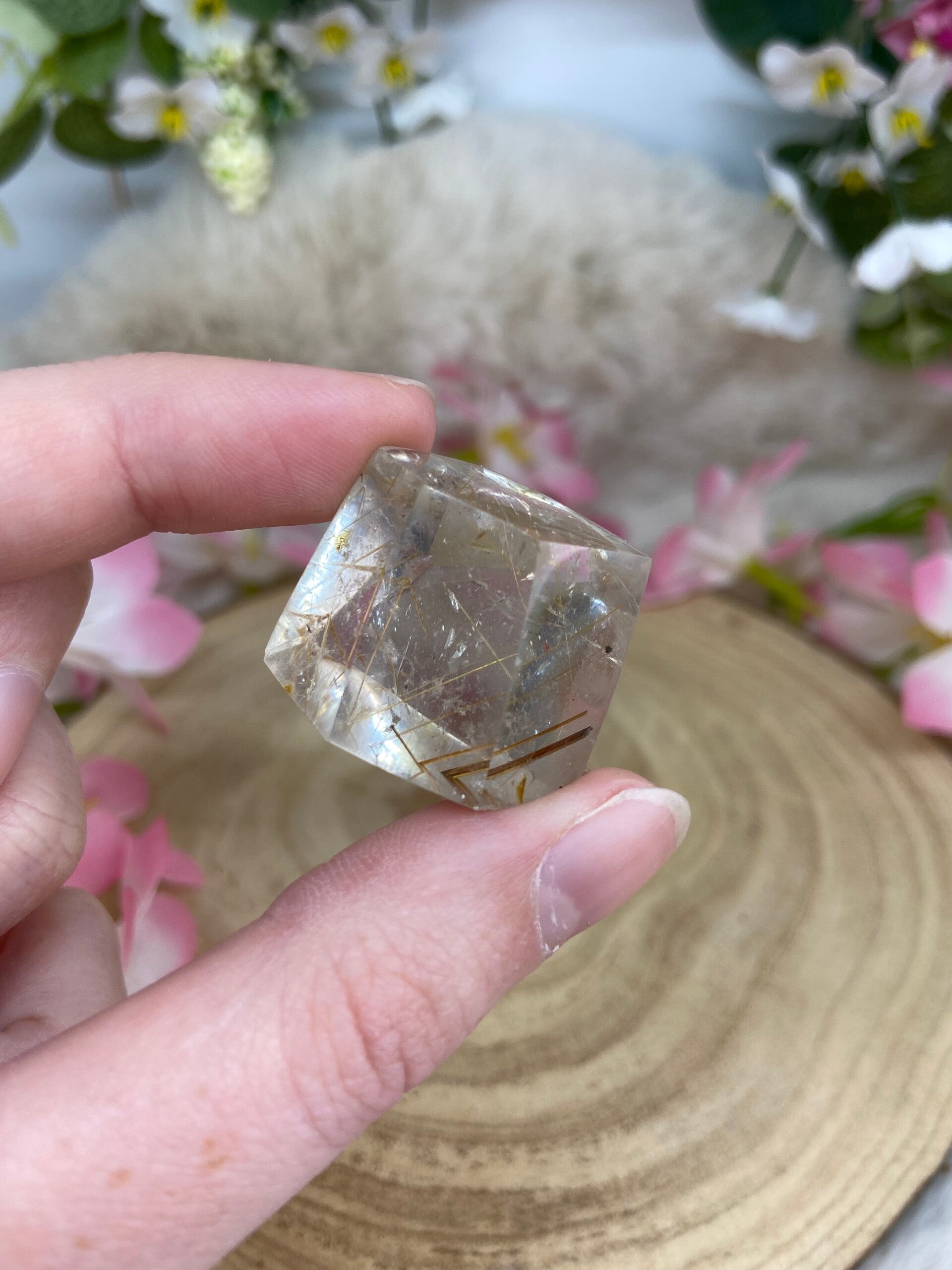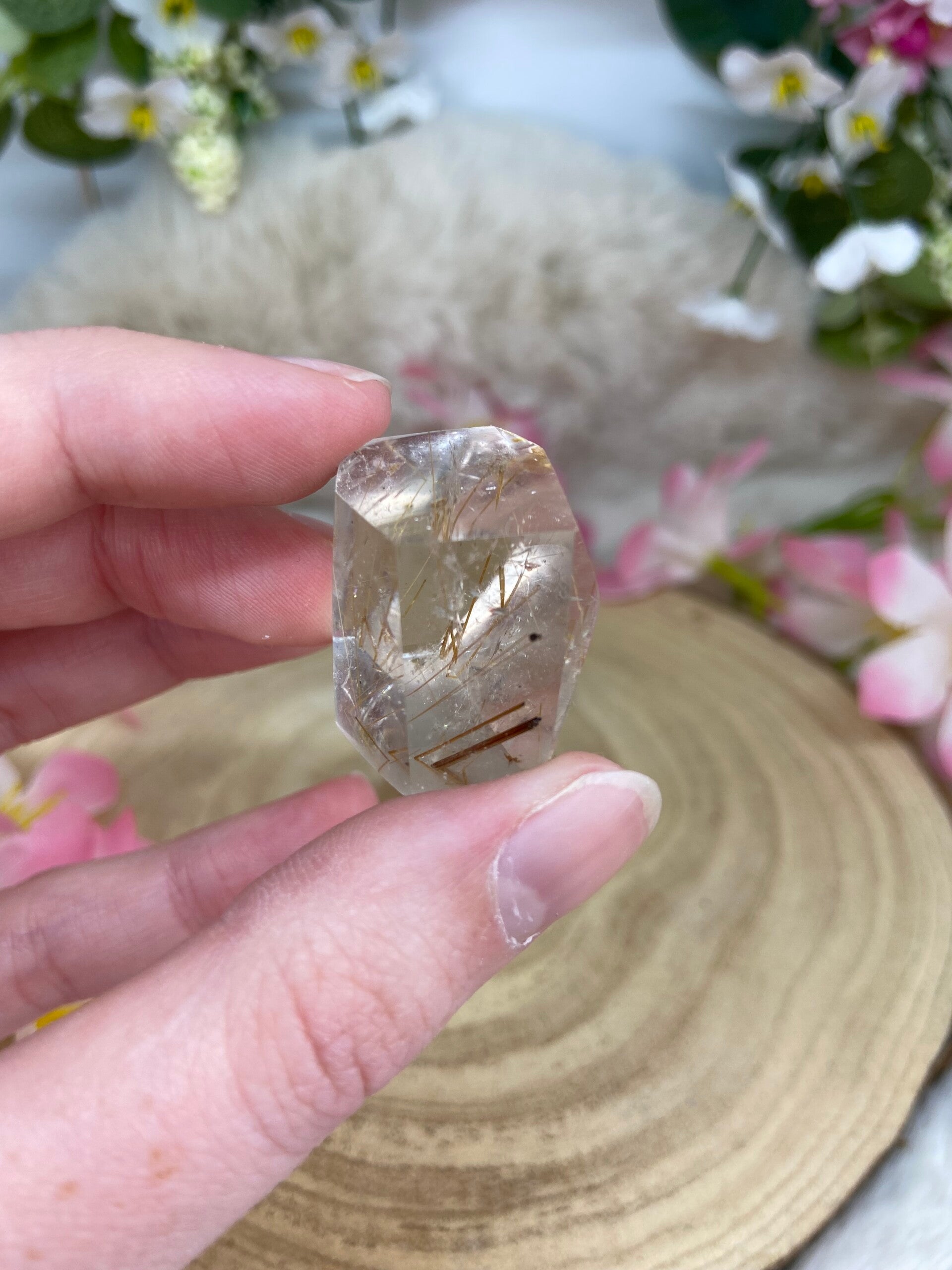 Klare Rutilquarz Freiform mit feinen gold-roten Rutilnadeln.