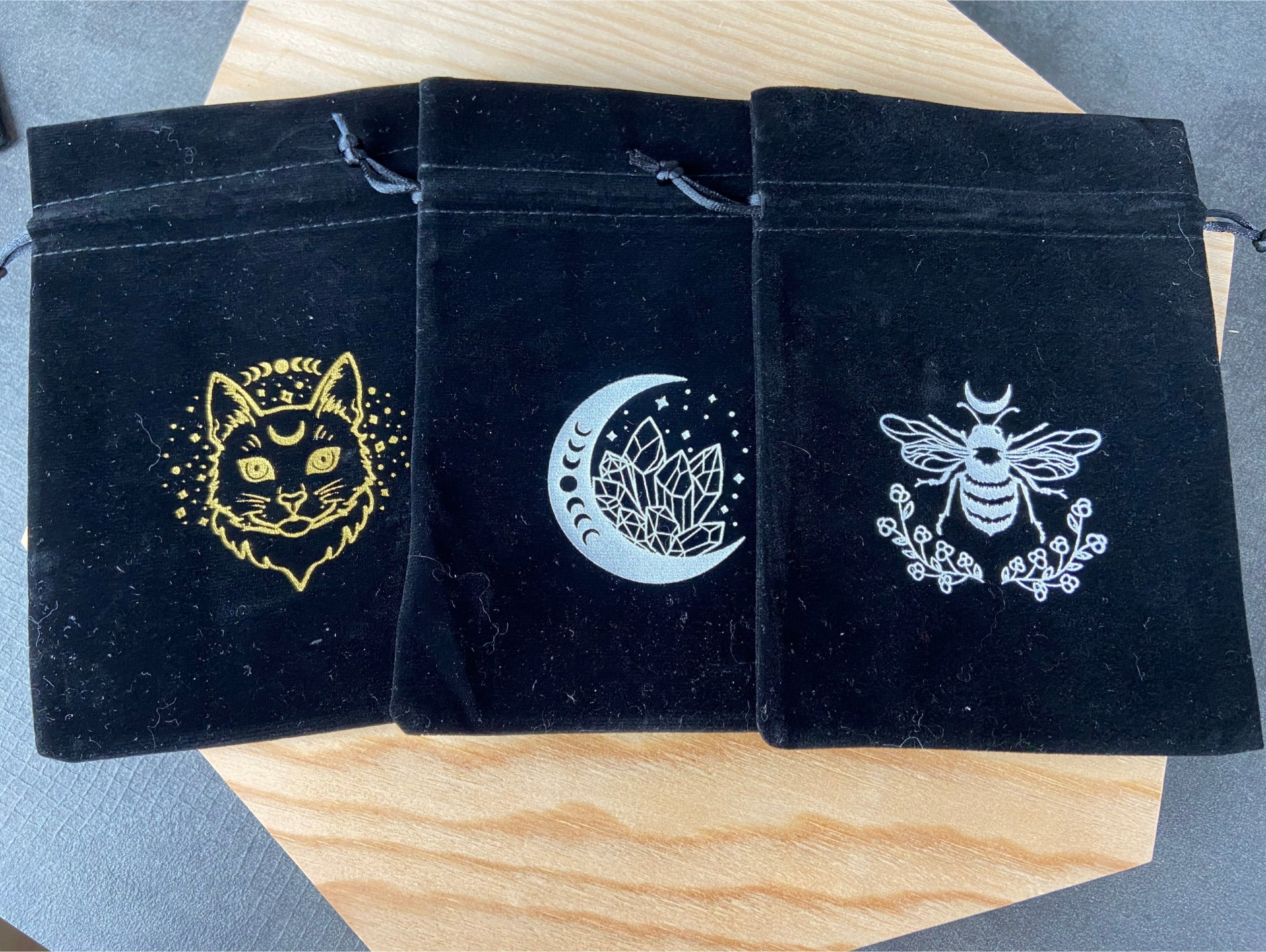Witchy Motive wie Katzen, Kristalle, Mond und Bienen.