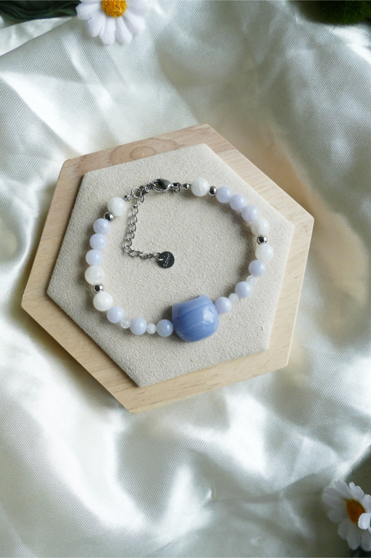 Dieses Edelstein Armband ist ein Einzelstück und wurde von mir handgefertigt. Es besteht aus Blue Lace Achat, Bergkristall und weißen Mondstein Perlen. Die Schleife in der Mitte ist auch aus lila Fluorit.