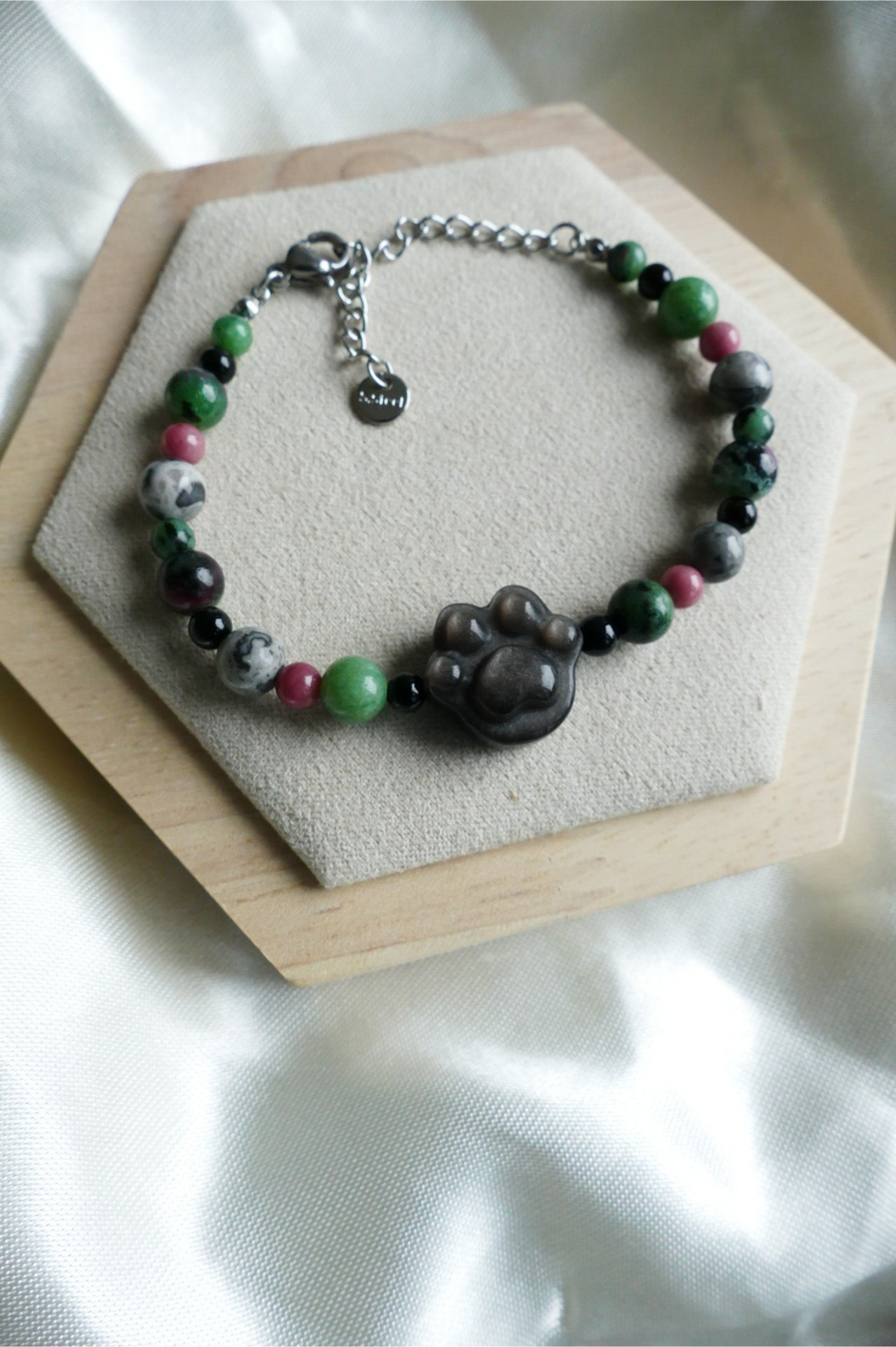 Dieses Edelstein Armband ist ein Einzelstück und wurde von mir handgefertigt. Es besteht aus Rubin in Zoisit, Rhodonit, Picasso Jaspis und schwarzen Achat Perlen. Die Pfote in der Mitte ist aus Silberobsidian.