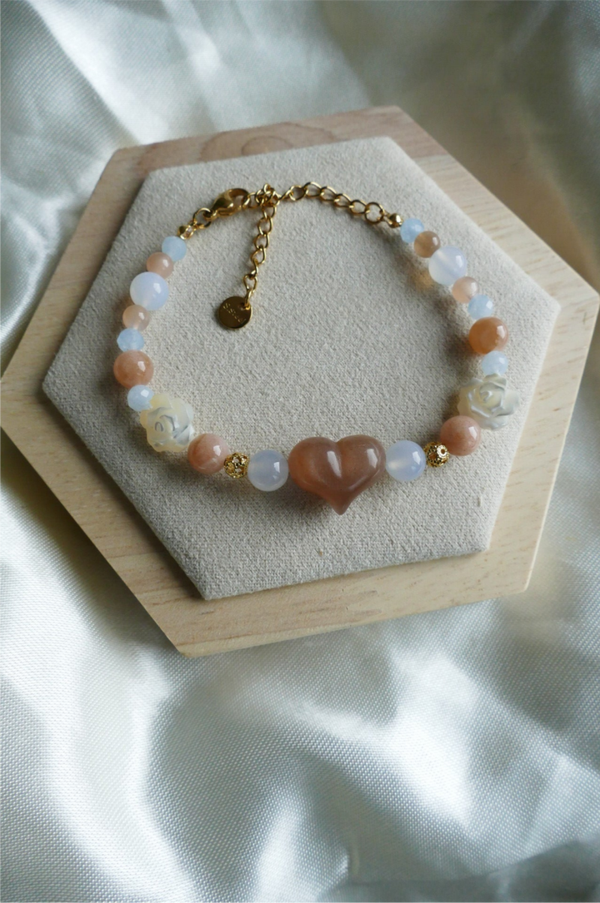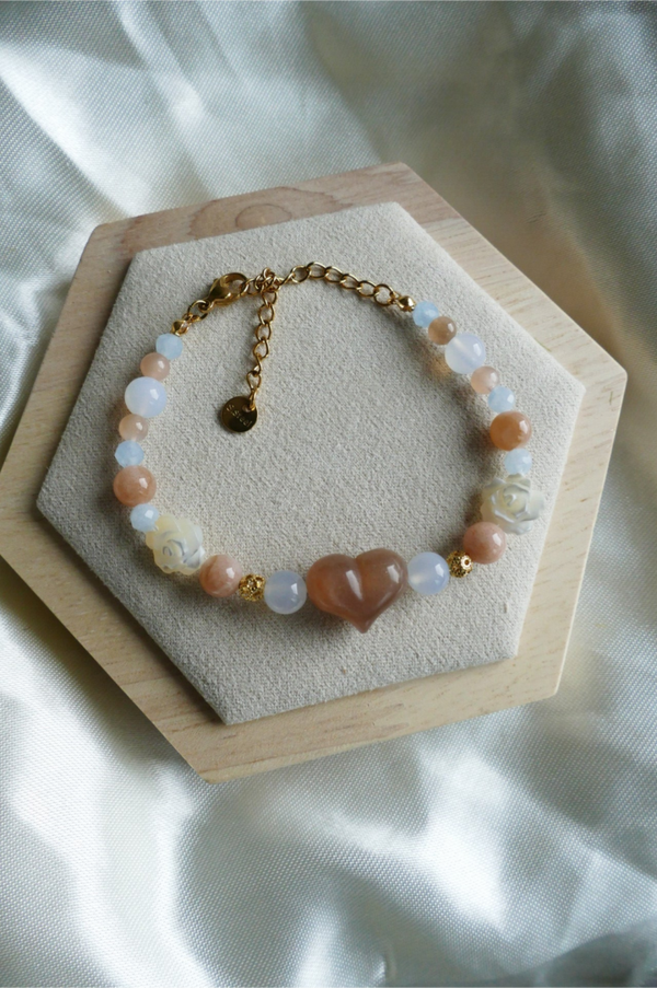Dieses Armband steht für Sanftheit und Weiblichkeit. Der orange Mondstein mit Sonnenstein stärkt deine Intuition und der Aquamarin bringt dich zur Ruhe.