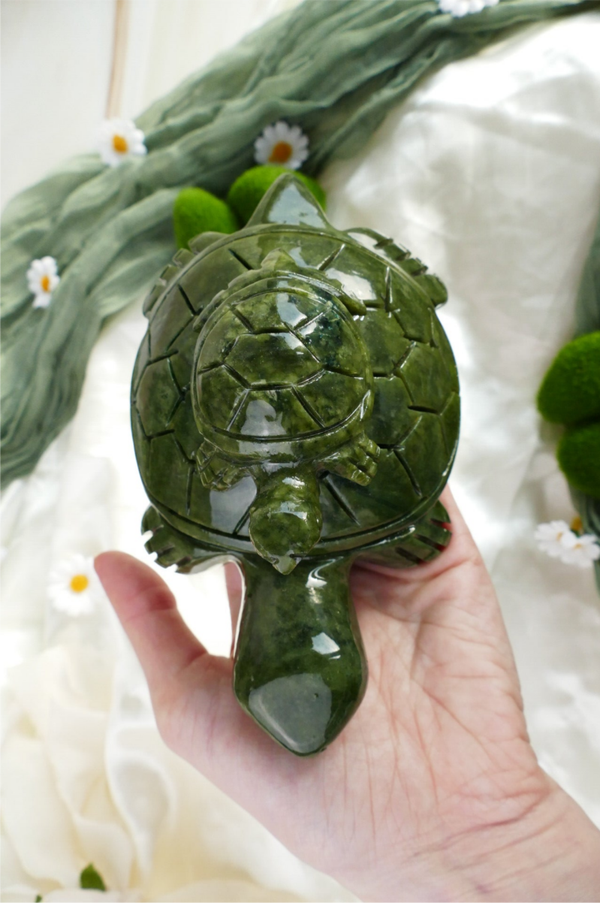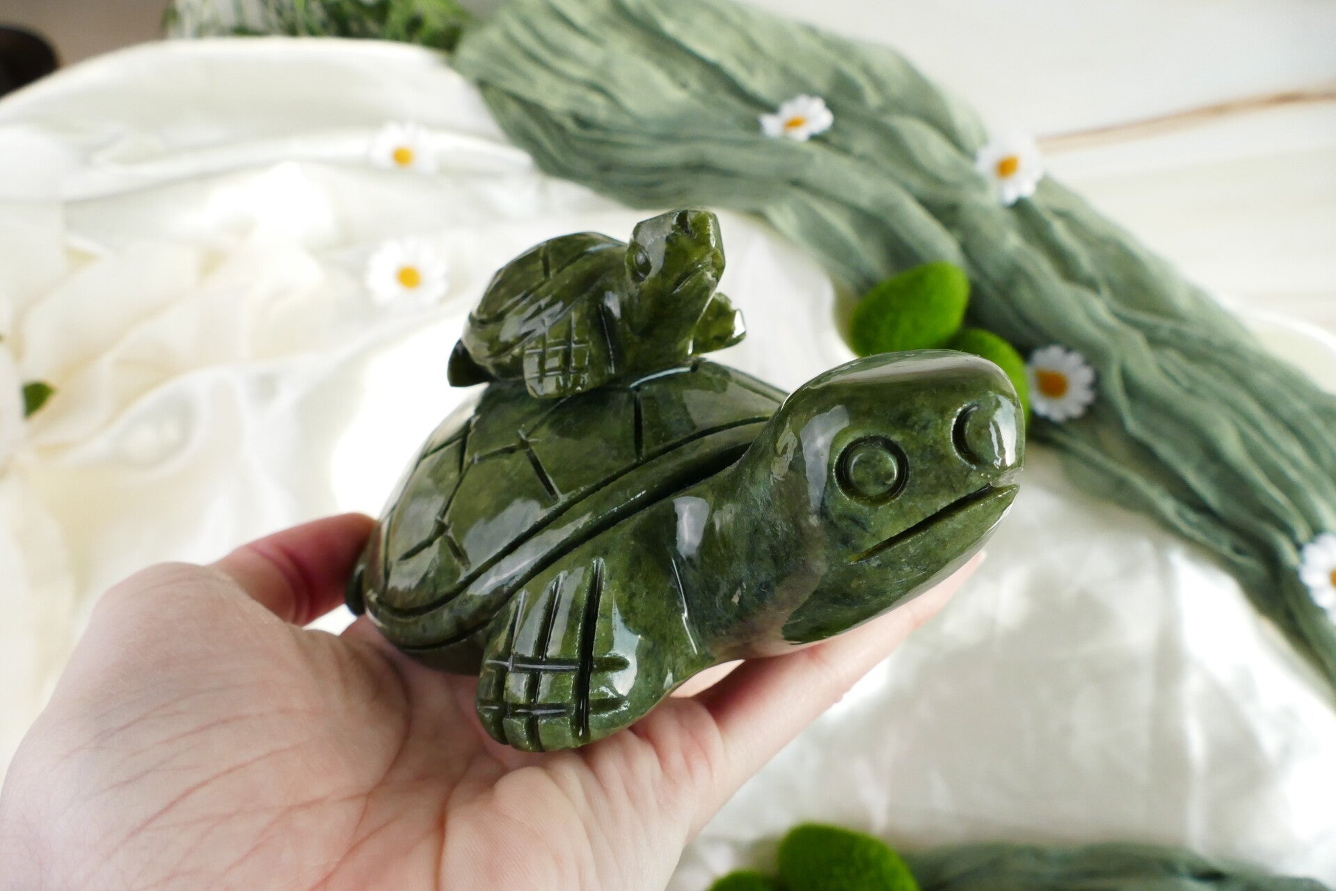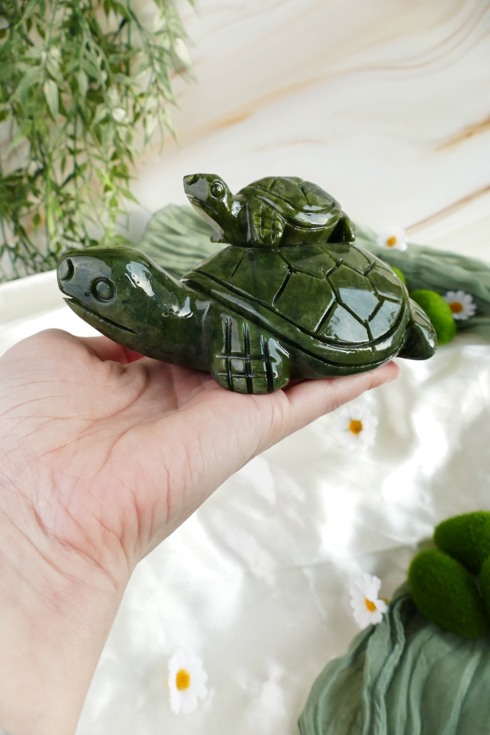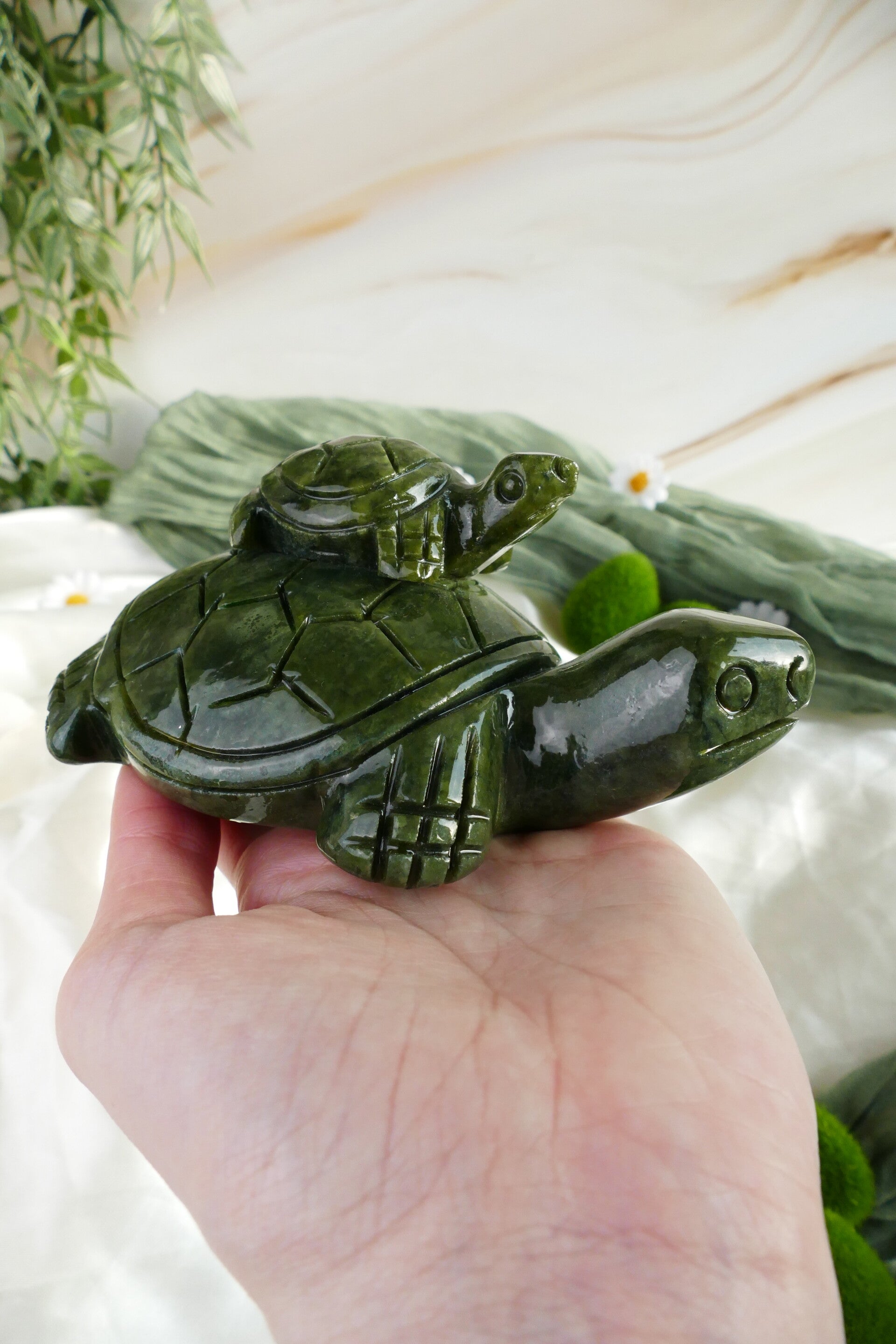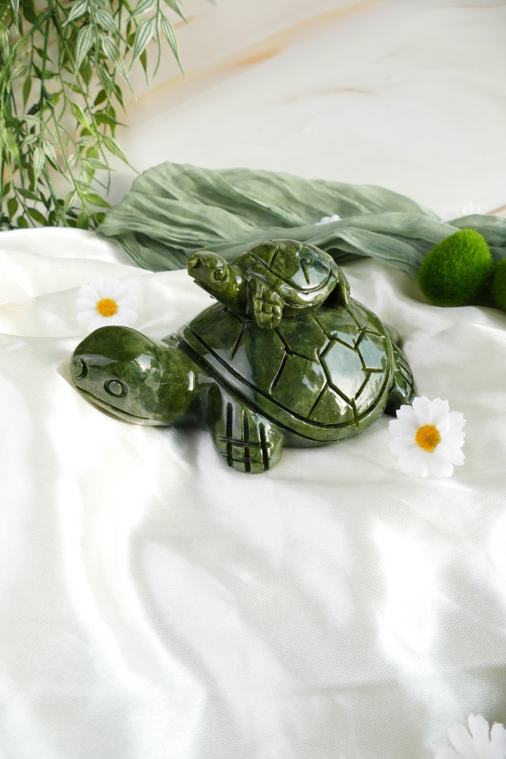 Grüne Jade Schildkröte mit kleiner Schildkröte auf dem Rücken.
